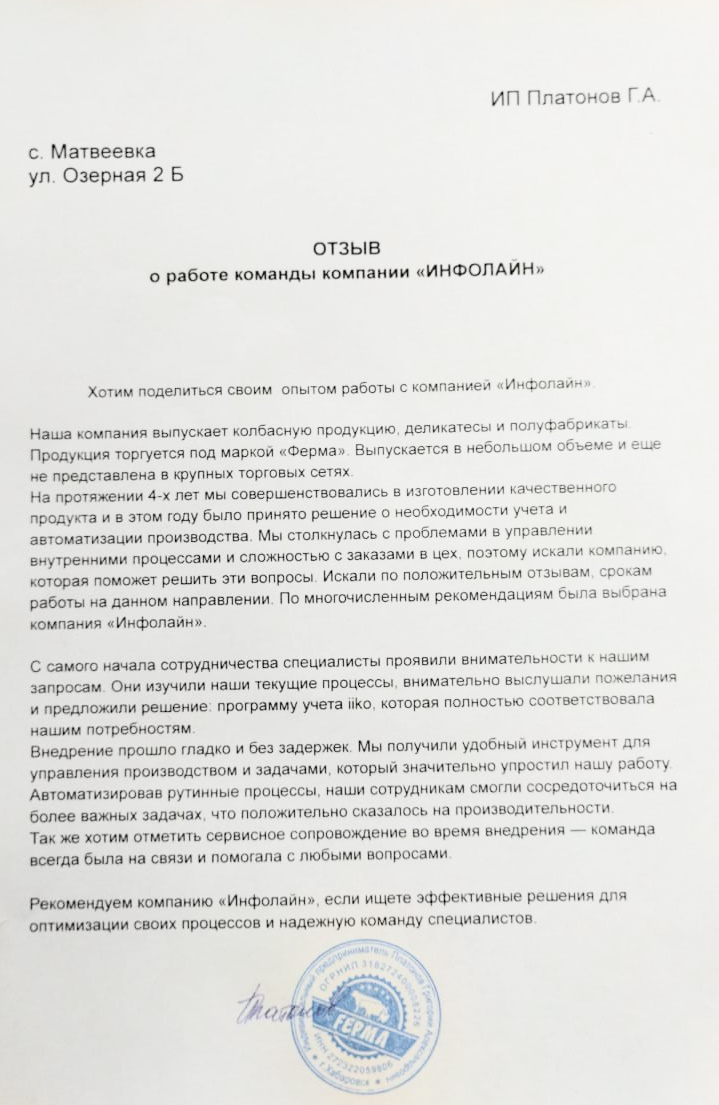 На протяжении 4-х лет мы совершенствовались в изготовлении качественного продукта, и в этом году было принято решение о необходимости учета и автоматизации производства. Мы столкнулись с проблемами в управлении внутренними процессами и сложностью с заказами в цех, поэтому искали компанию, которая поможет решить эти вопросы. Искали по положительным отзывам, срокам работы в данном направлении. По многочисленным рекомендациям была выбрана компания «Инфолайн».
