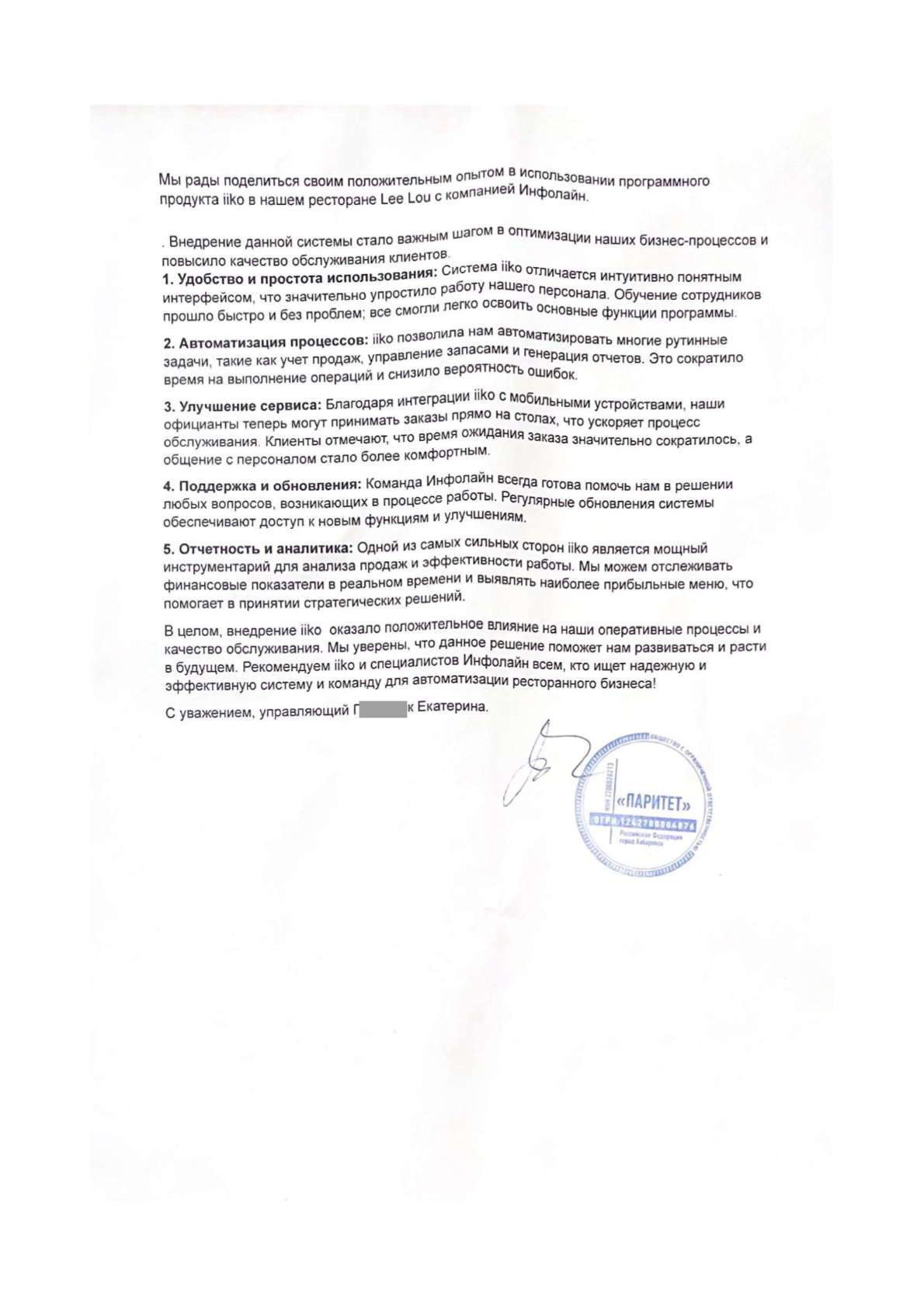 Мы рады поделиться своим положительным опытом в использовании программного продукта ilko в нашем ресторане Lee Lou с компанией Инфолайн.