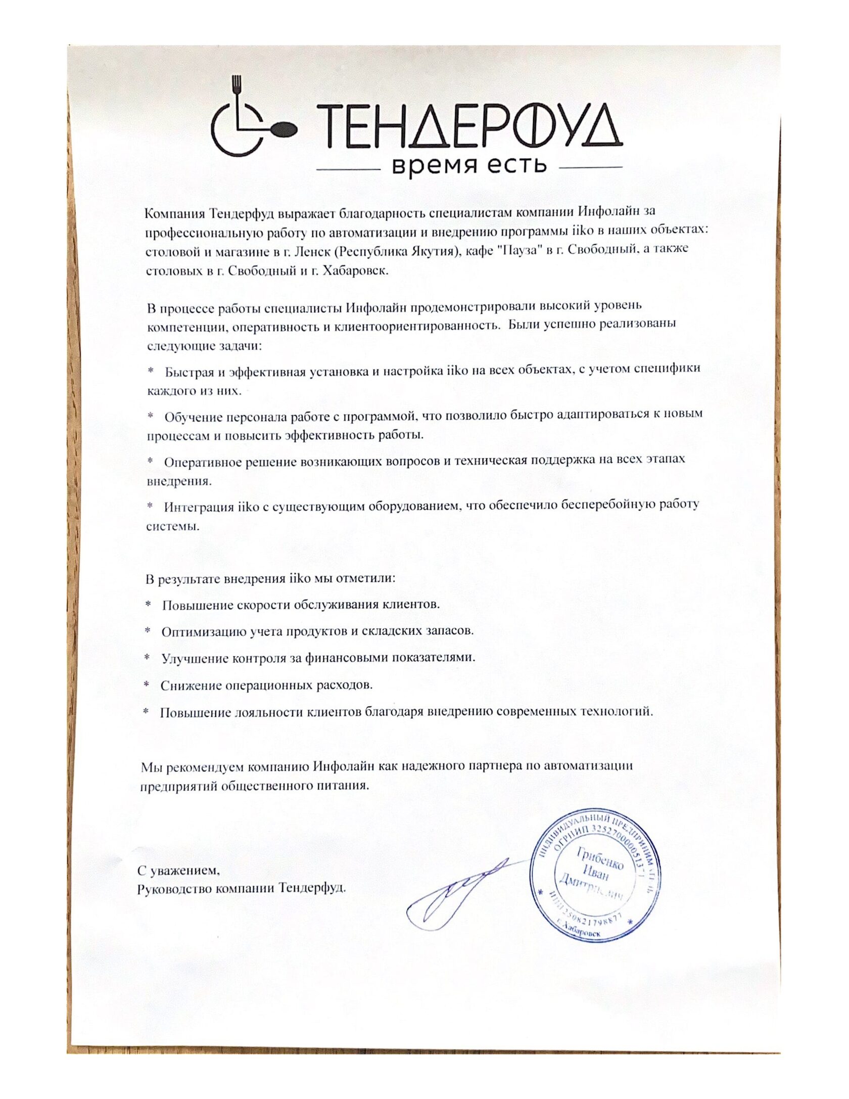 Компания Тендерфуд выражает благодарность специалистам компании Инфолайн за