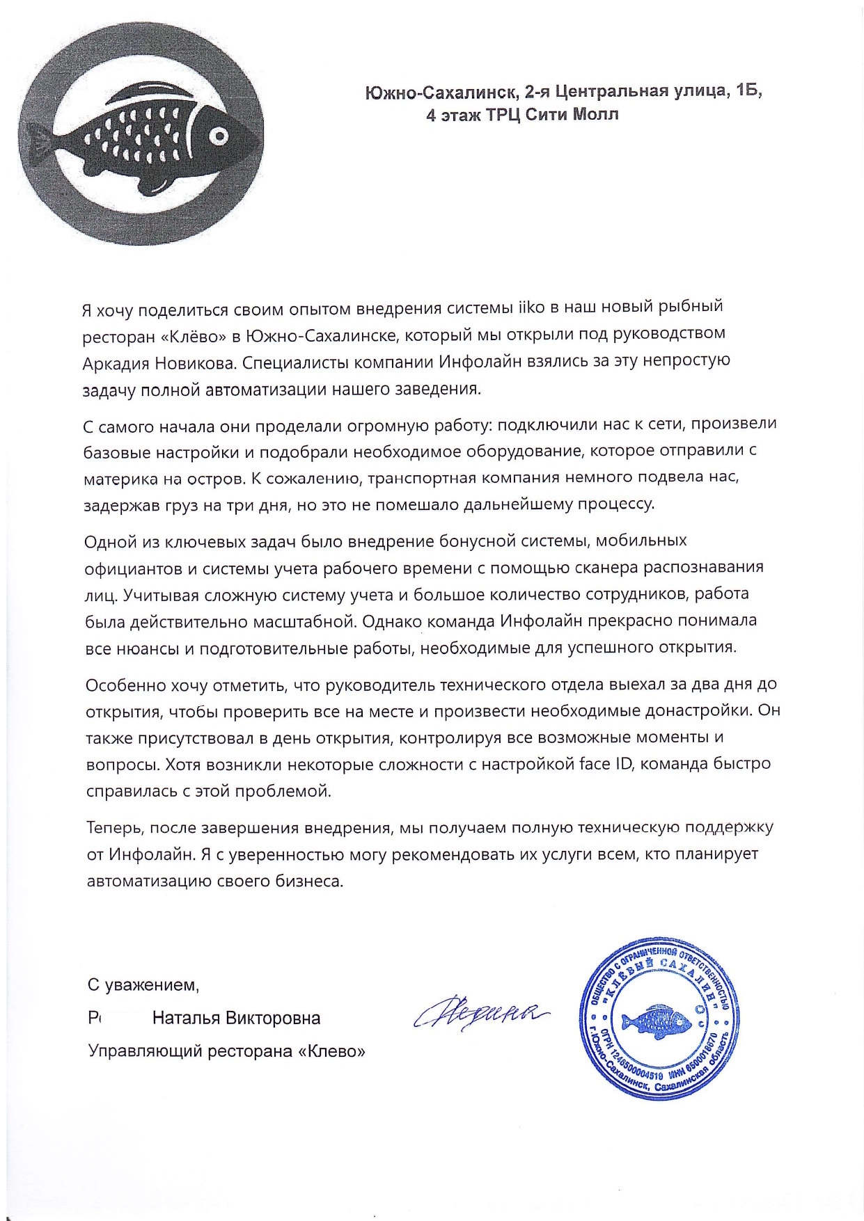 Я хочу поделиться своим опытом внедрения системы ilko в наш новый рыбный ресторан «Клёво» в Южно-Сахалинске, который мы открыли под руководством Аркадия Новикова. Специалисты компании Инфолайн взялись за эту непростую задачу полной автоматизации нашего заведения.