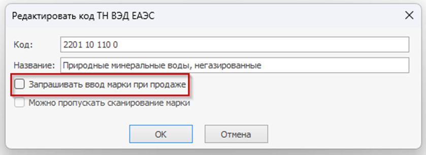 В справочнике кодов ТН ВЭД ЕАЭС в настройках кода снимите галочку Запрашивать ввод марки при продаже.